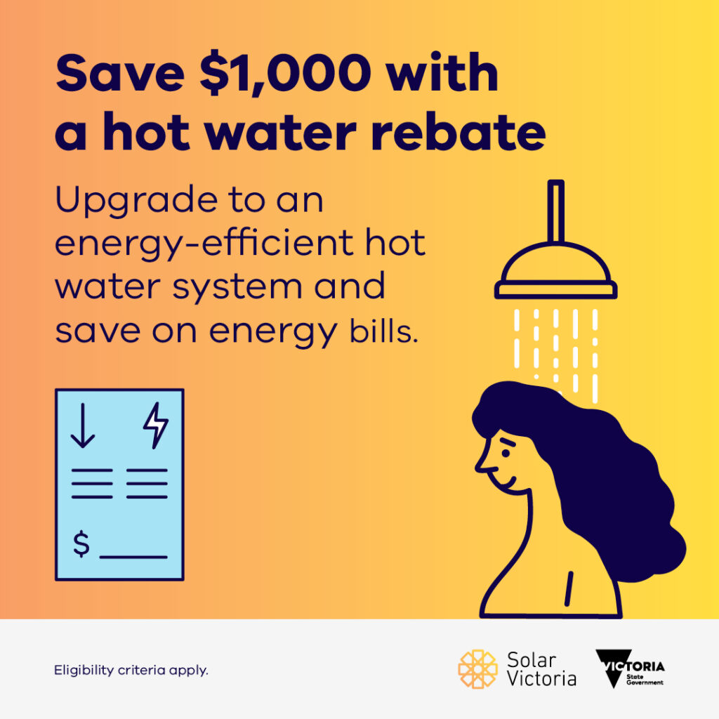 The hot water rebate provides Victorian households up to $1000 to assist with the purchase of an eligible heat pump or solar hot water system.